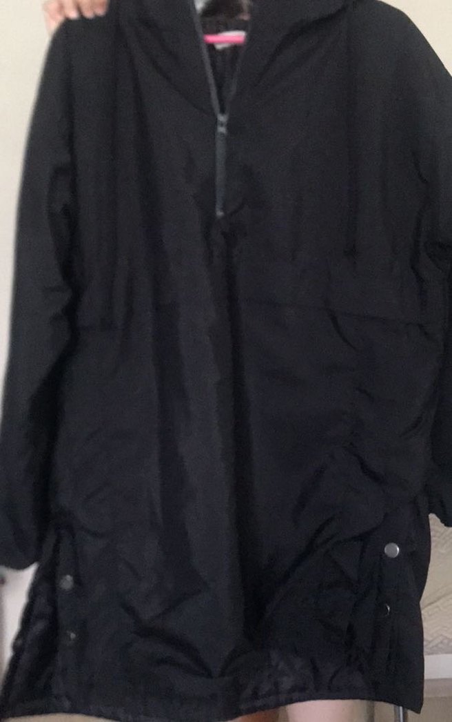 uzun yağmurluk, yüksek yakalı ve uzun kolludur. Sentetik kumaştan üretilmiş, fermuarlı ve bol kesimdir. Günlük kullanım için uygundur