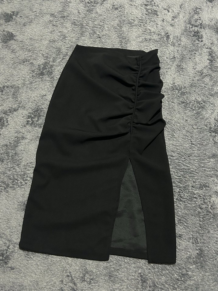 Siyah uzun etek, dar kesim ve fırfır detayları ile dikkat çeker. Sentetik kumaştan üretilmiş, günlük kullanıma uygundur. Az ve temiz kullanım defosu yoktur