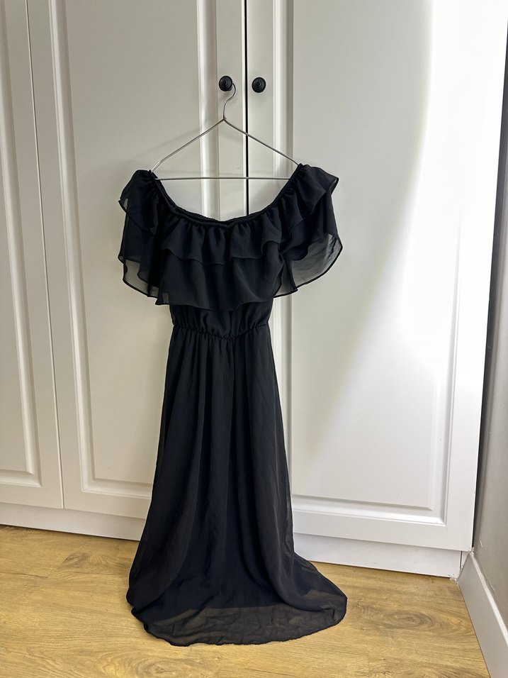 Siyah uzun elbise, kayık yaka ve fırfırlı detaylara sahiptir. Askılı kolları ve bol kesimiyle romantik akşamlar için uygundur. Hamileykende 1 kere normaldede giydim 1 kere giydim. Tertemiz.