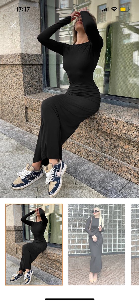 Siyah, uzun ve vücuda oturan bu elbise yüksek yakalı ve askılı kolludur. Günlük sokak stili için rahat ve şık bir tercih. Haki yeşili de mevcuttur