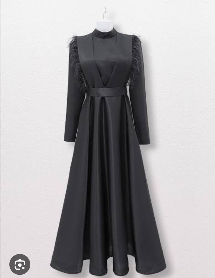 Bu siyah uzun gece elbisesi yüksek yakalı, askılı uzun kollu ve kemerli bel detayıyla klasik gotik tarzda, düzenli kesime sahip, ofis için uygun ve desensizdir.
