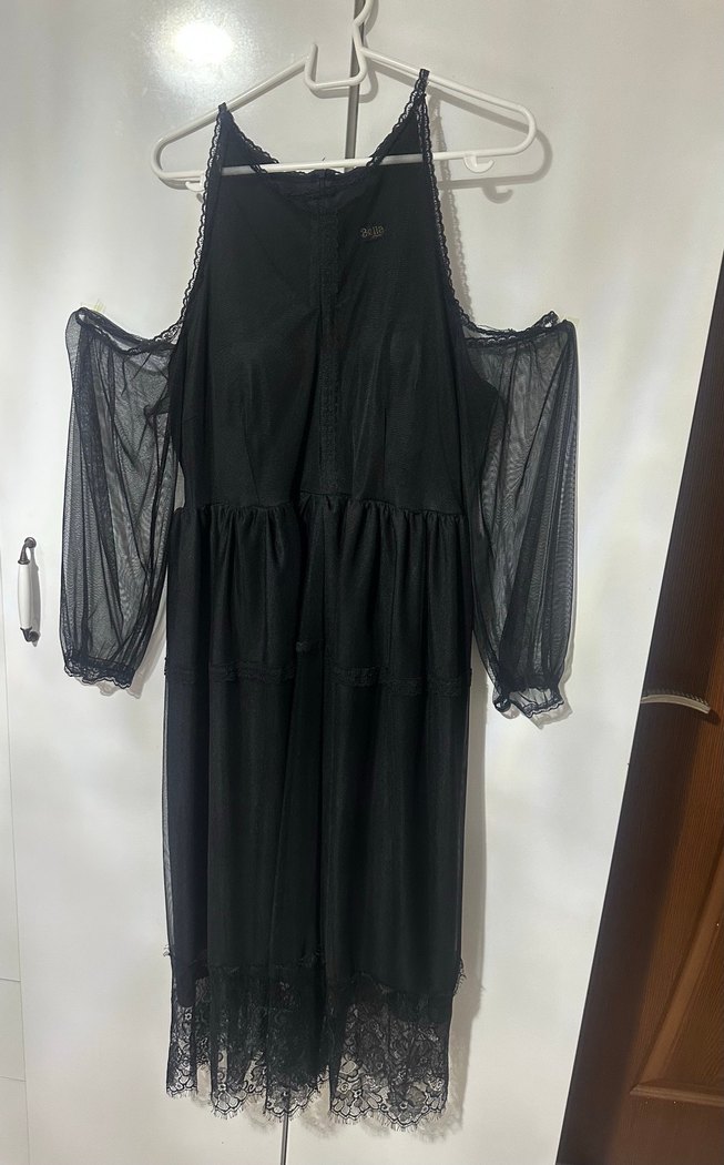 Siyah, uzun elbise, drapeli ve bol kesimdir. Askılı kollar ve dantel detayları gotik tarzı yansıtır.