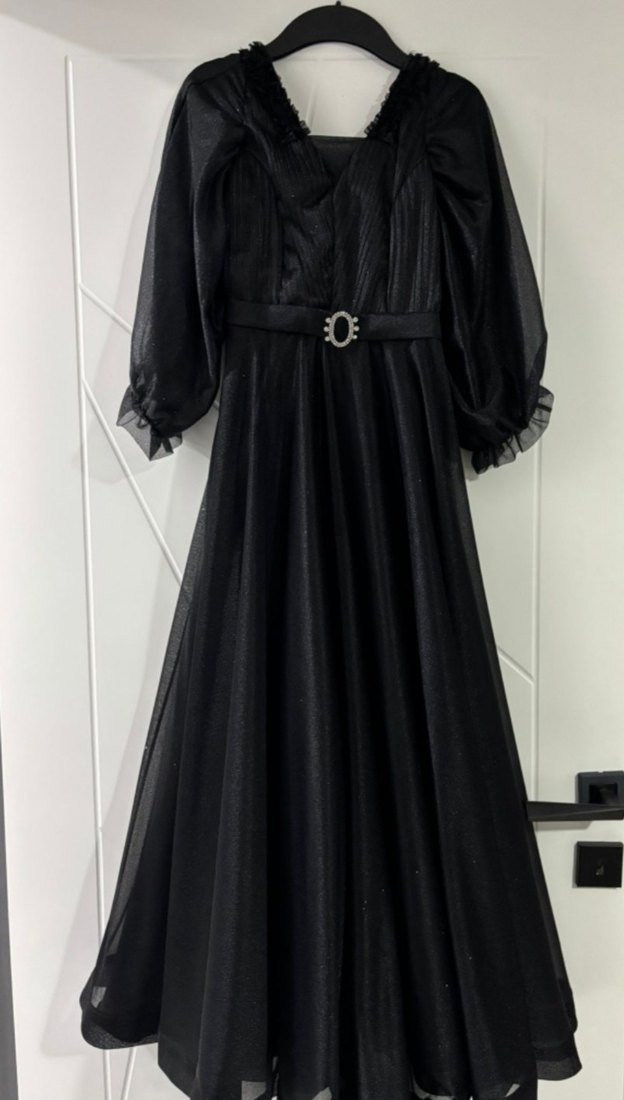 Siyah uzun abiye elbise, tekne yaka ve kemerli bel detayıyla klasik gotik şıklık sunar. Bol kesim, askılı kol ve düğünler için uygundur. ✨