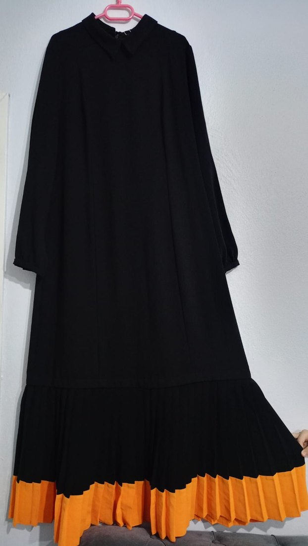 Siyah uzun elbise, yüksek yakalı ve bol kesimdir, suni kumaştan üretilmiş, modest gotik tarzda askılı kollara sahiptir. Alt kisminda turuncu fırfır detayi bulunuyor. etiket uzerinde sıfır ürün. 44 beden.