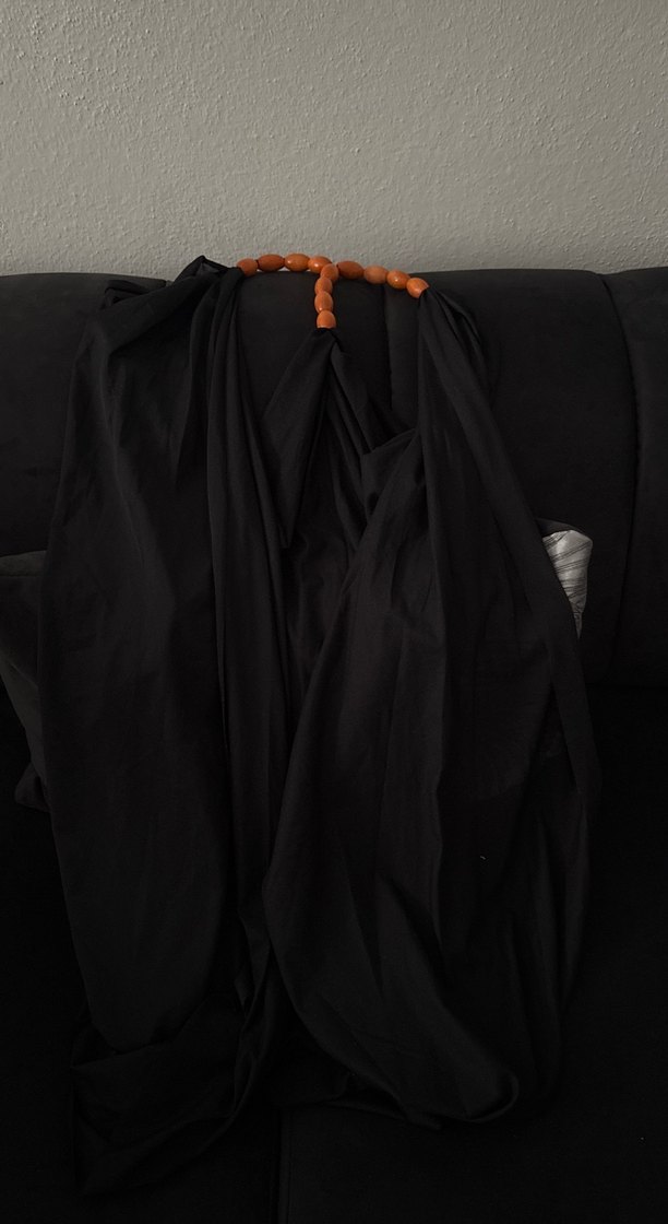Siyah, uzun boylu, ince kesim ve askılı kollu gotik tarzda kadın elbisesi. Desensiz ve şık tasarım.