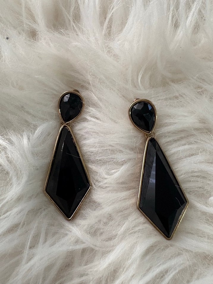 siyah uzun gotik küpeler. Klasik zarafetiyle romantik akşamlar için uygun, koyu ve desensiz tasarım.