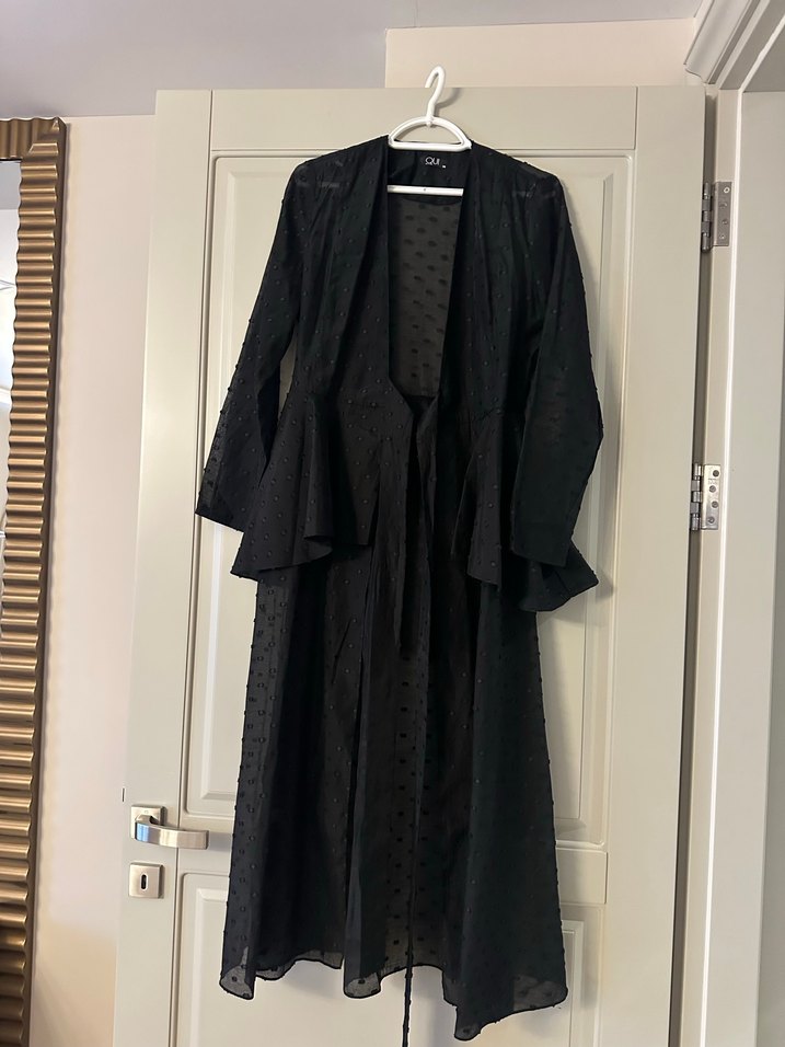 Siyah uzun hamile keten ceket, drapeli ve yakalıdır. Uzun kollu, düzenli kesim, minimalist gotik tarzda, ofis kullanımı için uygundur. Desensiz ve mütevazı.