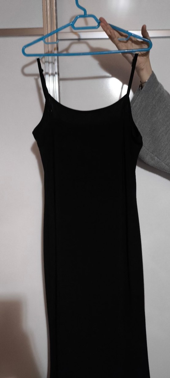 Siyah uzun boy, ince askılı, kayık yaka triko elbise. Düz, uzun elbise ve dar kesin günlük kullanıma uygun, şık ve rahat bir görünüme sahiptir.