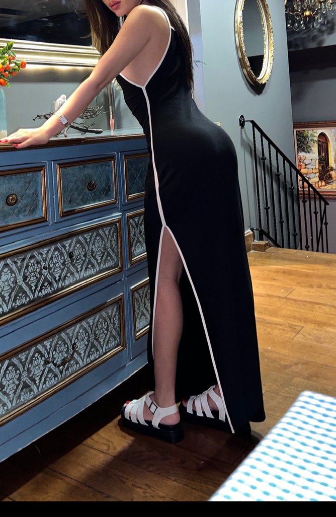 Yüksek yakalı, ince askılı, vücuda oturan siyah uzun elbise, yumuşak sentetik kumaştan. Minimalist tasarımda hafif drapeli, sokak modasına uygun.