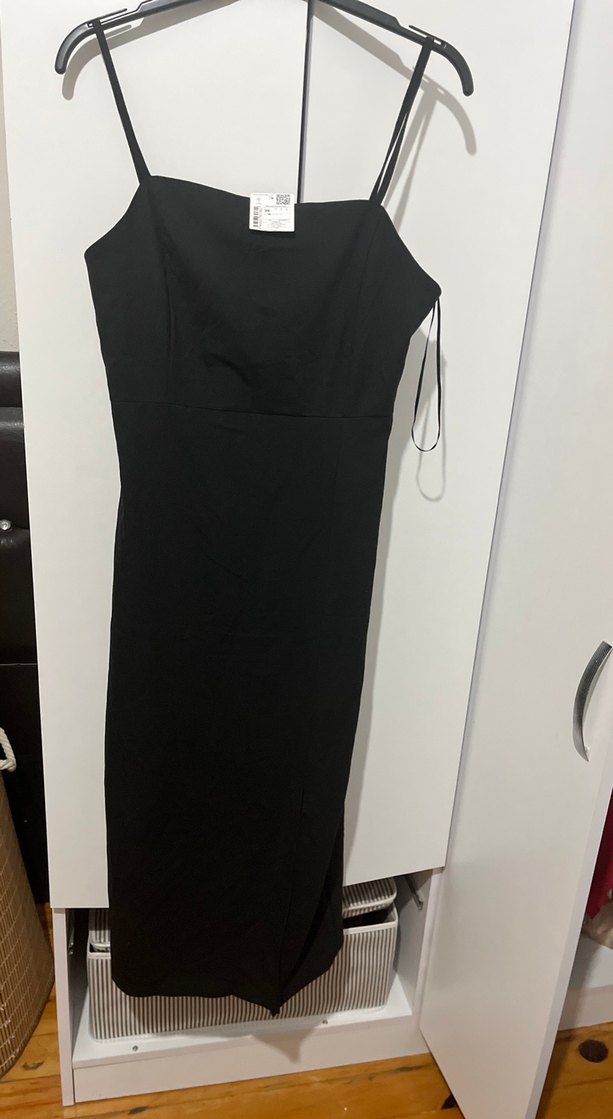 Düz siyah, uzun ve ince askılı kadın elbisesi, düz yaka ve minimalist tarzıyla şık ve avant-garde bir görünüm sunar.