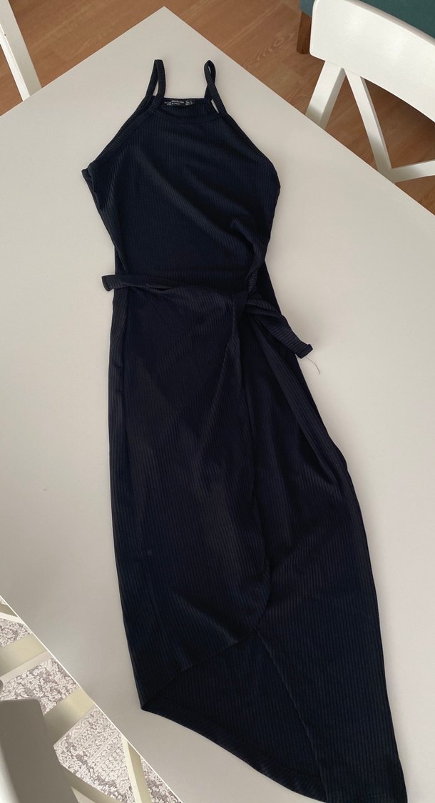 Siyah Uzun İnce Askılı Kemerli Elbise