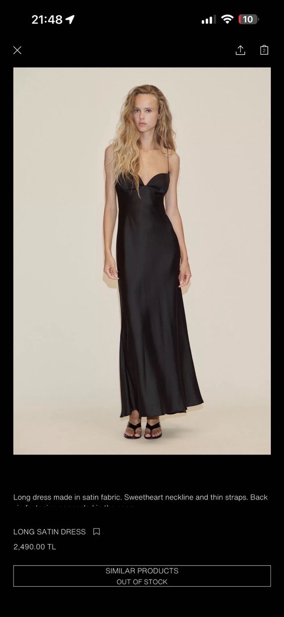 Siyah uzun elbise, ince askılı ve kalp yaka ile fitted kesime sahip. İpek görünümlü kumaştan, romantik akşamlar için uygun.