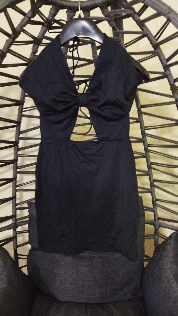 Siyah, v yaka ve ip detaylı, uzun kesim gotik tarzda, drapeli ve vücuda oturan parti elbisesi.