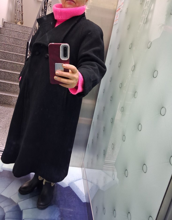 Siyah renkte, düğmeli ve geniş kollu uzun kaban. Soğuk havalar için uygun, klasik bir model.