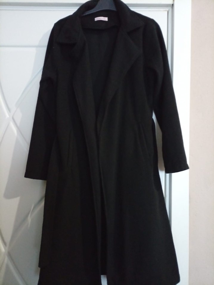 Siyah uzun kaban, klasik yakalı ve sade şıklıkta, soğuk havalar için uygun.