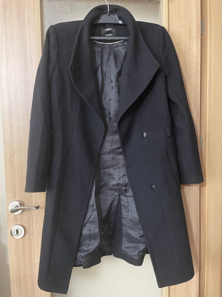 Klasik yakalı siyah uzun kaban, iç kısmı düzgün astarlı, soğuk havalar için ideal.