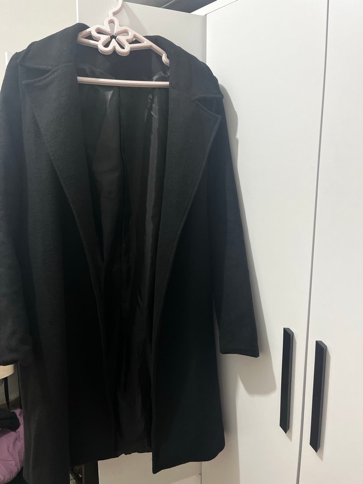 Sade tasarımlı, içi düz astarlı siyah uzun kaban. Klasik yakalı ve uzun kolludur, serin havalar için uygundur.