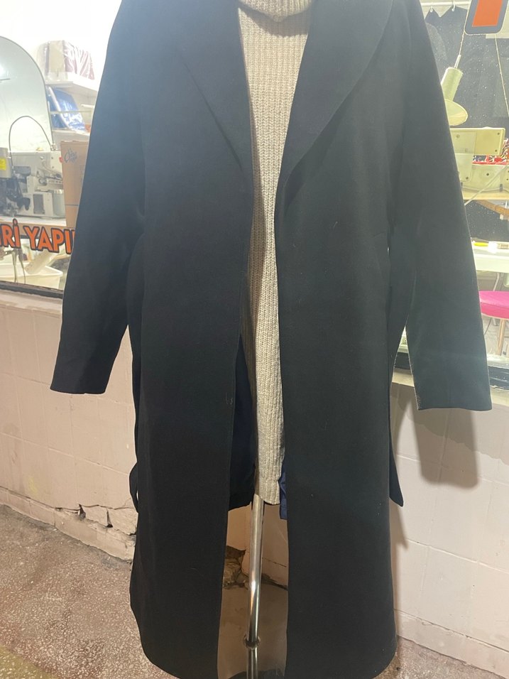 Siyah uzun kaban, düz kesim ve yakalı tasarıma sahiptir. Serin havalar için klasik ve şık bir görünüme uygundur.