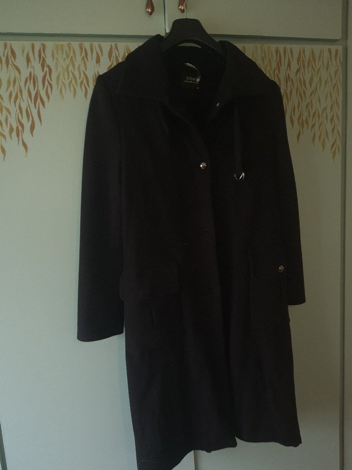 Bu siyah uzun kaban, yakalı ve düğmeli kapamaya sahip. Soğuk havalar için uygun, sade ve şık tasarımlı.