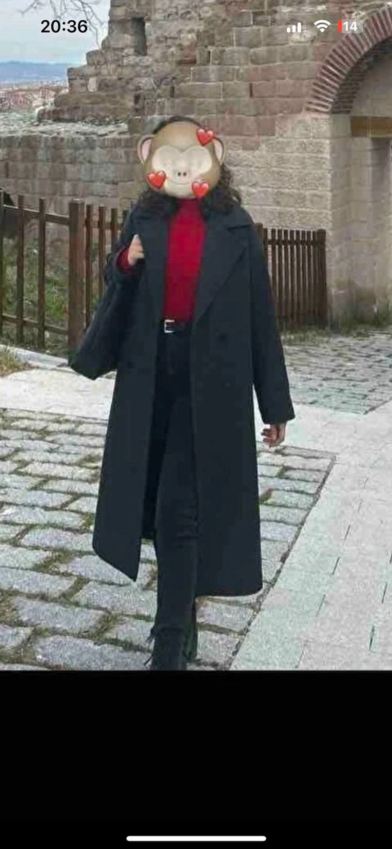 Klasik yakalı, uzun siyah kaban, soğuk havalar için uygun.