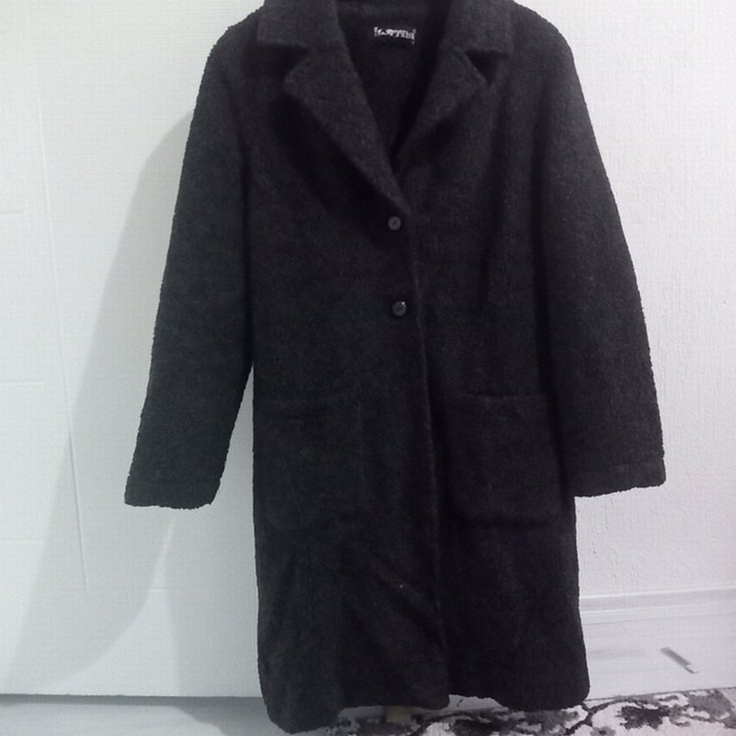 Yumuşak dokulu siyah uzun kaban, yaka ve ön düğmelerle tamamlanmıştır. Soğuk havalar için uygundur.