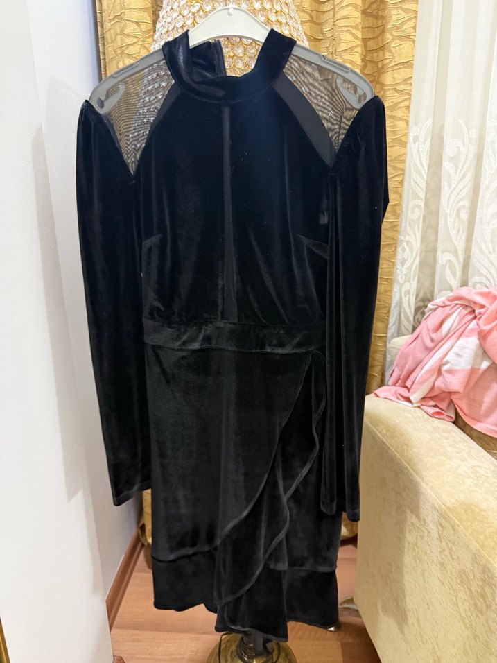 Yumuşak kadife kumaştan, tül detaylı, uzun kollu ve yüksek yakalı, siyah avant-garde tarzlara uygun, romantik akşamlar için ideal.Etek kısmları katlı çok şık bir elbise yeni etiketli üründür