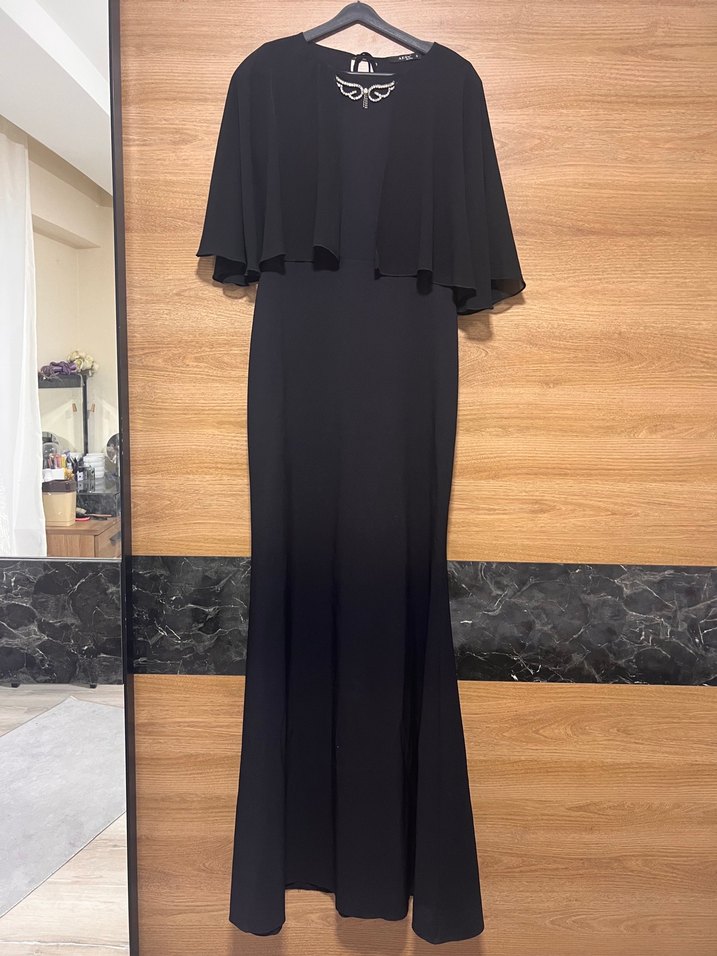 Siyah uzun abiye elbise, balık modeldir kalın askılı üzerinde sabit tül var boyun kısmındaki süste kararmalar mevcut