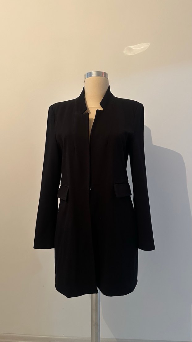 Siyah, uzun kesim, düğmeli ve yakalı kadın blazer. İpeksi dokusuyla klasik ve şık bir ofis görünümü sağlar.