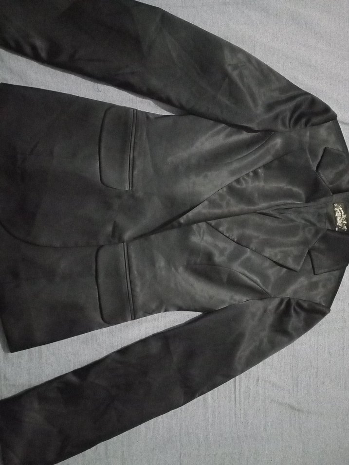 Kadınlar için, yakalı, düğmeli, uzun kollu, düzenli kesim, siyah renkli, saten dokulu uzun blazer ceket. Ofis için goth tarzında şık bir seçim. bedeni 36-38