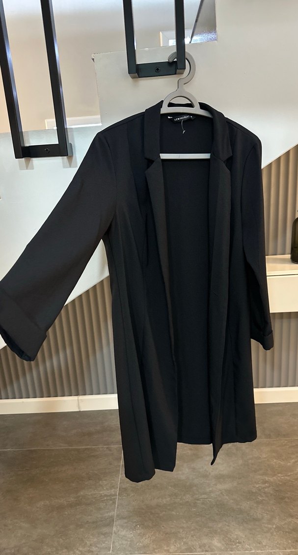 Siyah renkli, yakası kırmalı ve uzun kollu kadın blazer ceket. Boy 95cm