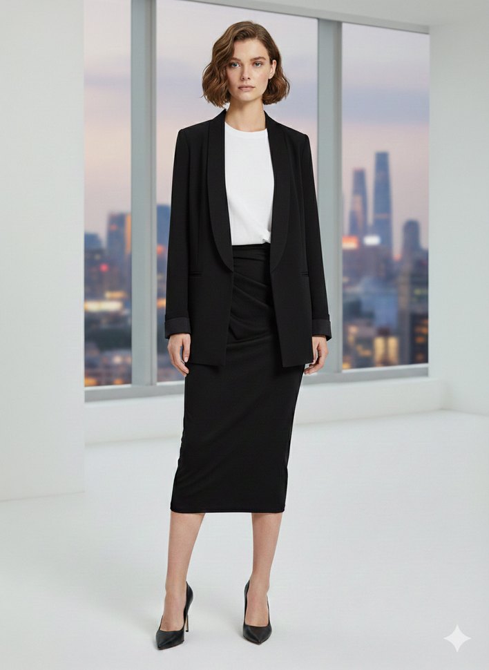 Siyah uzun kesim kadın blazer ceket, notched lapel yakalı ve uzun kolludur. Düz ve pürüzsüz sentetik kumaştan yapılmış, ofis için çağdaş ve şık bir görünüme sahiptir.