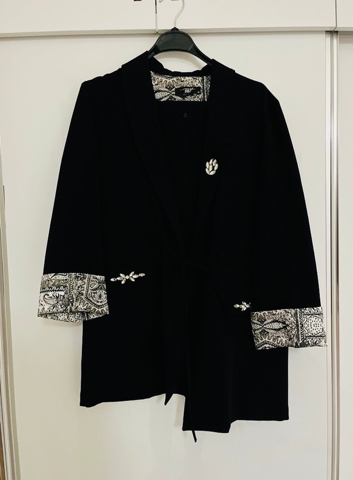 Bir kez giyildi sıfırdan farksız sorunsuz tasarım takımdır .Düğmeli kapamalı, yakalı siyah uzun kadın ceket. Desenli kumaş manşetlere ve klasik kesime sahiptir, ofis kullanımı için uygundur. #msm #my312 #takım #venöve