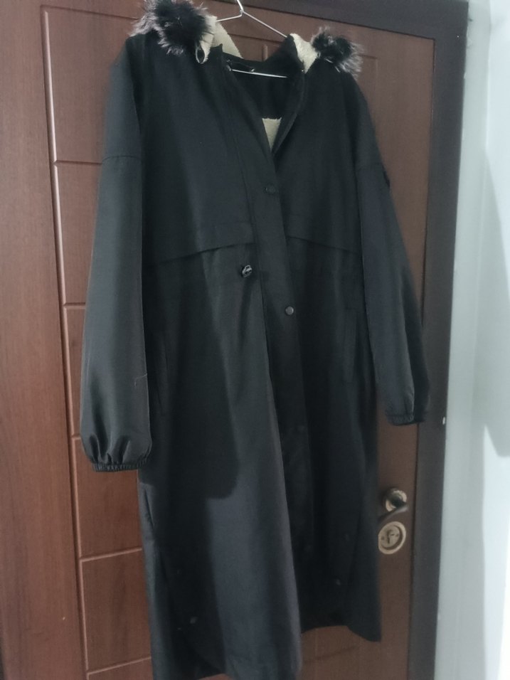 Siyah uzun kadın ceket, bol kesim ve yakalı tasarıma sahiptir. Kürk detaylı kapüşonu ve yumuşak dokulu fleece kumaşıyla rahat bir kullanım sunar. Günlük kullanım için uygundur.