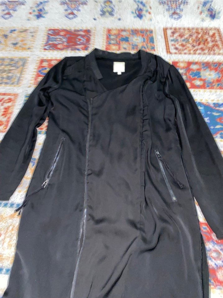 Siyah, uzun olan bu ceket, notlu yaka ve fermuarlı ceplere sahiptir. İpeksi kumaşı, bol kesimi ve uzun kollarıyla sokak modasına uygundur.