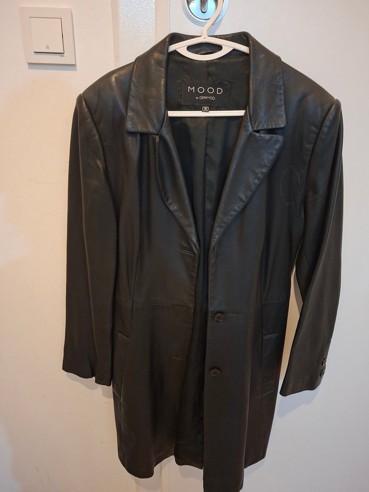Siyah uzun deri ceketin düğmeli önü ve keskin yakası vardır. Uzun kollu ve klasik şıklık sunar, ofis kullanımı için uygundur.