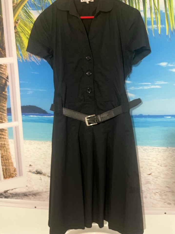 Kısa kollu, yakalı uzun siyah elbise. Sentetik kumaştan, bol kesim, ofis kullanımı için uygundur.
