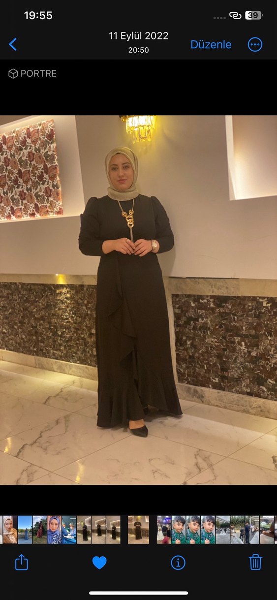 Siyah uzun elbise, Yüksek yakalı ve uzun kolludur.