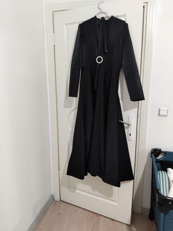 Siyah renkte, uzun kollu, kemerli ve yakası kesik detaylı, vücuda oturan uzun elbise. Düz ve şık tasarımıyla günlük kullanıma uygundur.