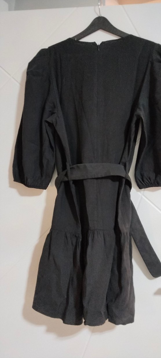 Siyah uzun kadın elbise, salaş kesim ve balon kollara sahiptir. Minimalist gotik tarzda, kemerli ve desensizdir.