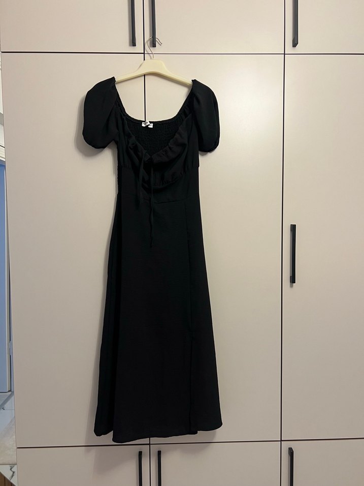 Siyah uzun keten elbise, tek parça ve vücuda oturan kesime sahip. Kayık yaka ve ince askılarla minimal gotik tarz sunar. Günlük kullanıma uygundur.