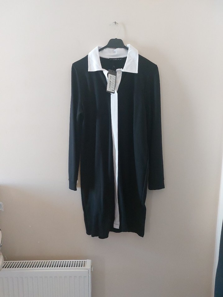 Siyah uzun kadın tunik elbise, beyaz yakalı ve düğmeli, yumuşak ve sıcak kumaştan üretilmiştir. Regular fit ve uzun kolludur, ofis ve günlük şıklık için uygundur.