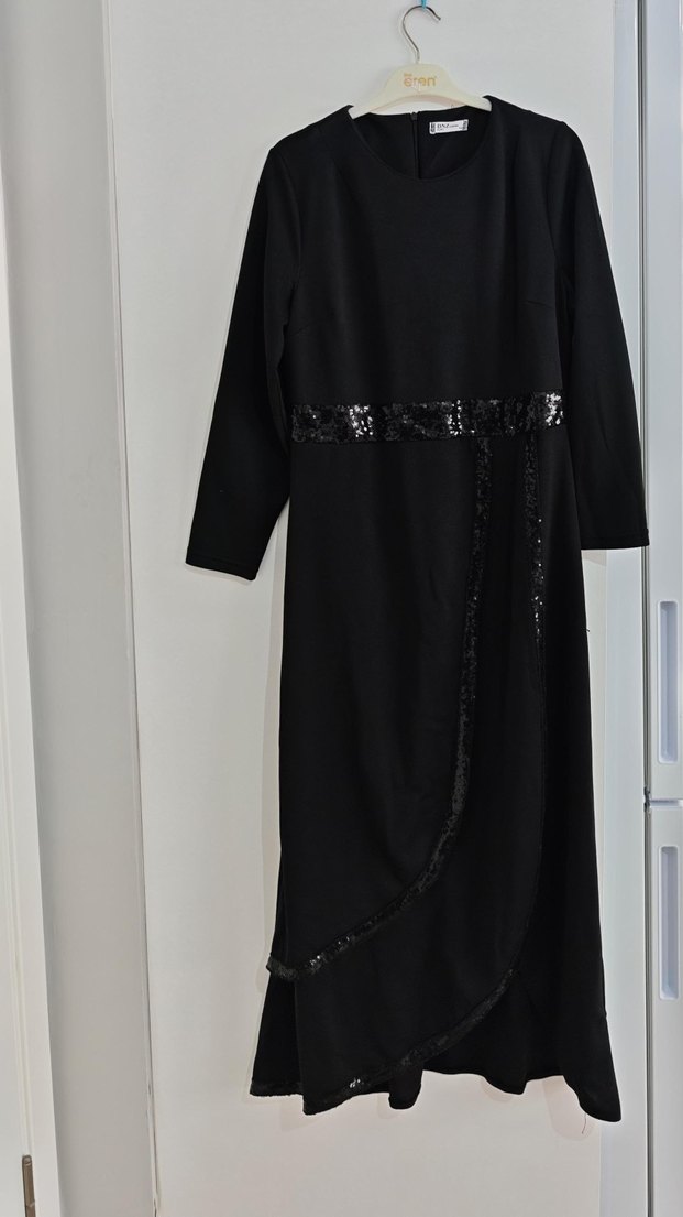 Drapeli tasarımlı, yılan desenli siyah uzun kadın elbisesi. Yuvarlak yaka ve rahat kesime sahip, günlük kullanıma uygun.