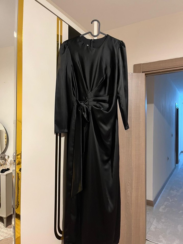 Siyah uzun elbise, ipeksi kumaş, drapeli tasarım ve yakasında kesimli rever bulunur. Strappy kollu, regular fit ve gotik stil için uygundur.