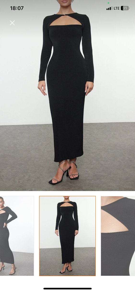 Bu siyah uzun kadın elbise, kayık yaka ve ince askılı kollara sahiptir. Lastik görünümlü yumuşak dokulu kumaştan yapılmış, minimal ve çağdaş tarzda, ofis için uygundur. Desensiz tasarımı ile zahmetsiz şıklık sunar.