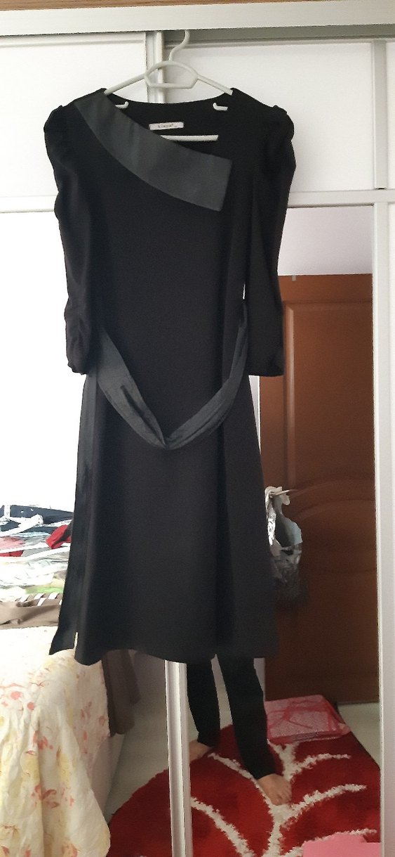 Saten dokulu, kemerli ve askılı siyah uzun elbise. Notlu yaka ve regular kesimle gotik stile sahip, ofis kullanımı için uygun.