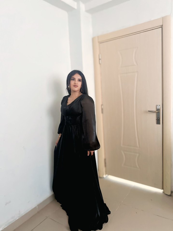 Siyah uzun elbise, ince ve ipeksi kumaşla, bol kesim ve drapeli tasarıma sahiptir. Uzun kollu ve V yakalı, düğünler için klasik şıklık sunar.
