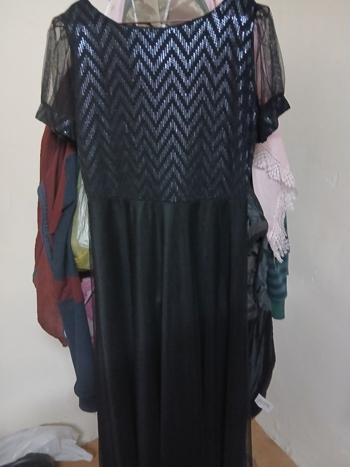 Bu siyah uzun elbise, yüksek yakalı, bol kesim ve drapeli tasarıma sahip, askılı kolludur. Sentetik kumaştan yapılmıştır, gotik ve avangart tarzlar için uygundur.