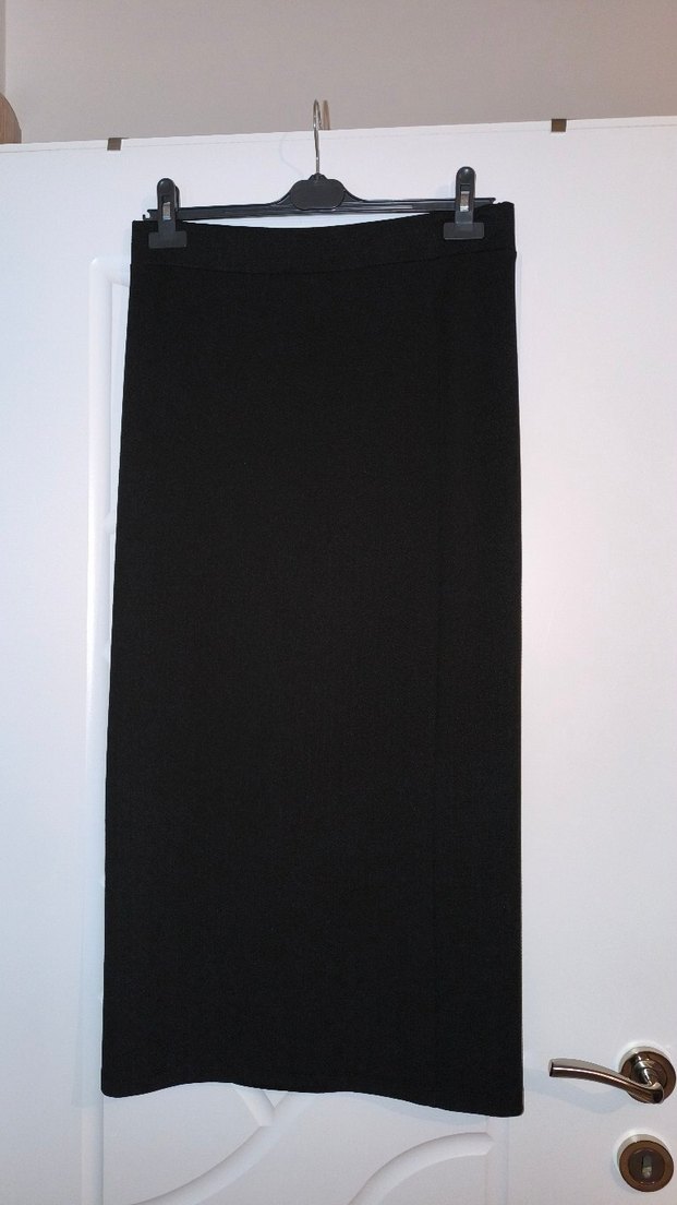 Siyah, düz kesim, sentetik kumaştan uzun etek. Minimalist ve desensiz tasarımıyla ofis kullanımı için uygundur. Zahmetsiz şıklık sunar.