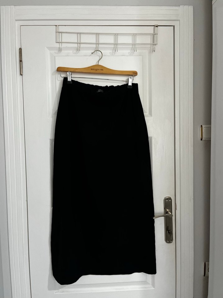 Siyah uzun kadın eteği, düz ve desen içermeyen tasarımıyla rahat bir kesime sahiptir. Ofis için uygun, sade ve şık bir görünüme sahiptir. Yumuşak ve sıcak kumaştan üretilmiştir.