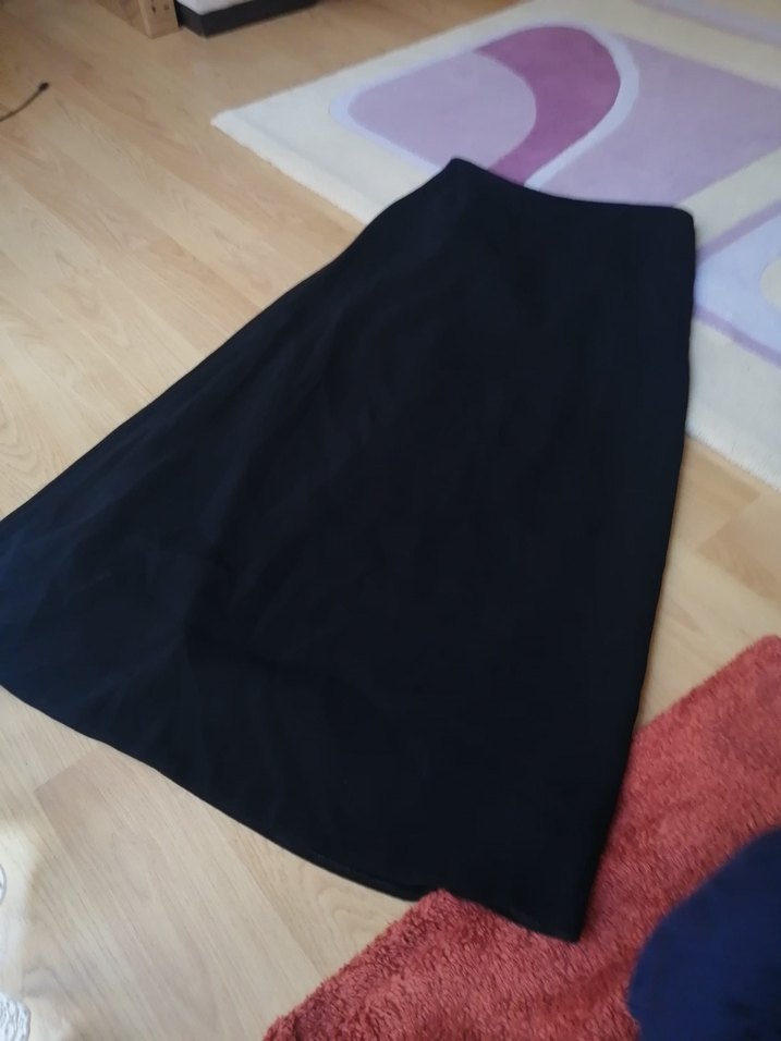 Siyah uzun etek, sentetik kumaştan, bol kesim ve tasarıma sahip, günlük kullanım için minimalist sokak stiliyle uyumlu.